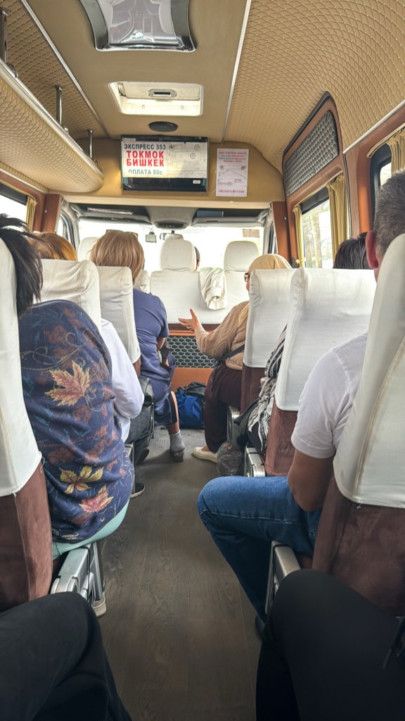 Curious, I pulled up Google Maps while we were still talking and asked if there was a bus that could take me there. So i packed my stuff around 9 in the morning and tried to find my way to the station she told me about. It was in fact hard to find because google maps was no help so i had to asked myself through. Most people here don’t speak English so it was not easy to communicate. You must either speak Kyrgyz or Russian. Turkish can sometimes help. Thank God people here are so nice they want to help you so bad, they try until they understand you. With a mix of hand gestures, broken Turkish, and my phone’s translation app, I eventually found my way. When I reached the bus station, the rest was easy. There were several mini busses, or how they call them: ‘Marshrutkas’. I had memorized the name of my stop “Cholpon-Ata” repeating it to myself at least 30 times back in the hostel. So I went from driver to driver, simply asking: “Cholpon-Ata?” Finally, I found the right one. The price? Just 400 COM for a four-hour journey—about 4€. In Germany, a trip of that distance would have cost me at least ten times more.