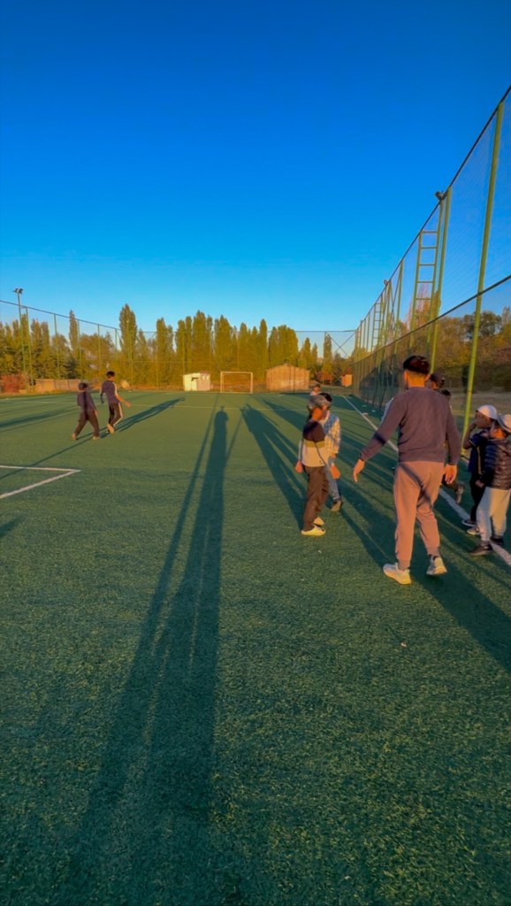 At first, Kegety might seem simple, grey, and not really welcoming, a place still echoing its Soviet past. But look closer, stay a little longer, and you’ll realize — this village has everything it needs, and soon, it starts feeling like home. The Kids have a sports building with a gym inside and a big hall where they mostly do Judo with a trainer. That evening, Eridan and I faced off in a Judo match. Despite being 10kg heavier than him, I lost — twice. Turns out that the technique is the most important factor in Judo. I think I was also just too tired from the flight ;D. They also have a full sized football pitch and additionally a soccer field with football goals with basketball hoops. Kyrgyz citizens have a deep-rooted connection to sports, a legacy from their Soviet heritage, where athleticism was an important part for belonging to the community.
