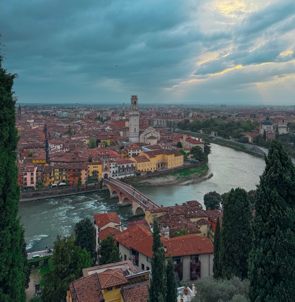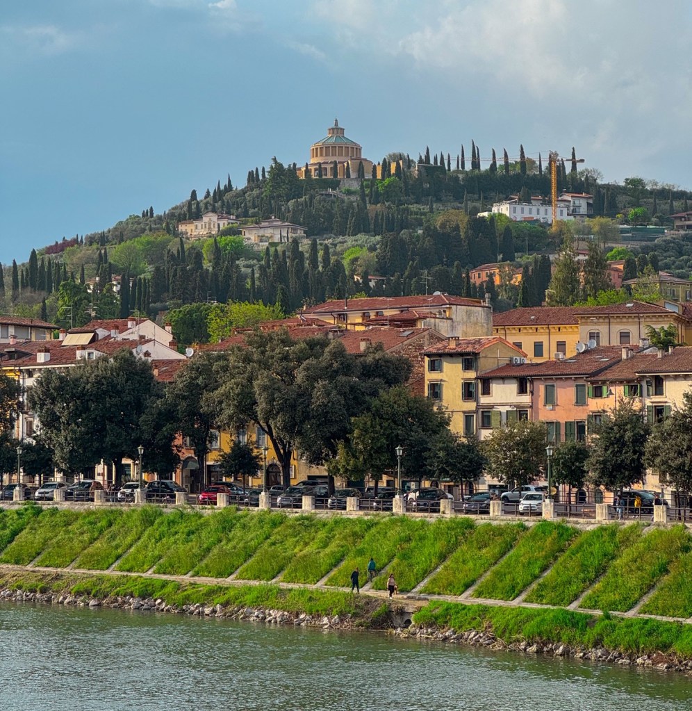 The church itself is worth a look — simple, quiet, and surrounded by cypress trees — but the real highlight is the perspective. From up here, Verona looks like a living map: the Adige River curling around the city, the terracotta rooftops stacked together, and the Roman bridges glowing in the afternoon light.