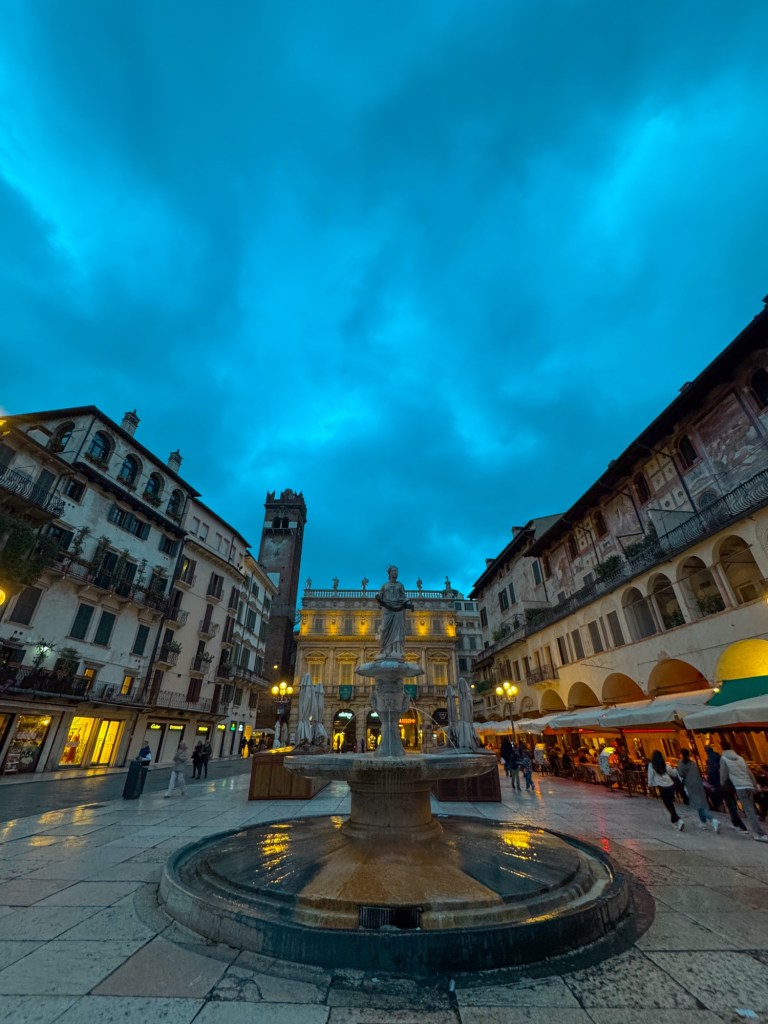 But when the evening starts, Verona changes. After a long dinner in one of the elegant restaurants, the atmosphere softens. People gather in the streets with glasses of wine, stylish locals laugh together, and the warm lights shimmer on the paving stones. Suddenly the 2,000-year-old Roman houses and bridges seem to glow. The heart of it all is Piazza delle Erbe, the most beautiful square in Verona. Standing there, you feel like you’ve stepped into a movie set.