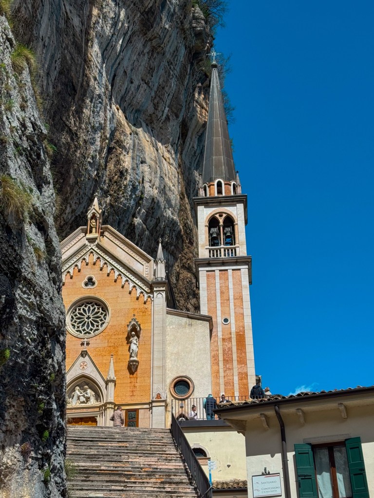 Built directly into the cliffs of Monte Baldo, the sanctuary seems to cling to the rock face, half hidden, half revealed. From the terraces you get a breathtaking view over the Adige Valley far below, the mountains rising all around you. It’s a setting so dramatic that it feels almost unreal.